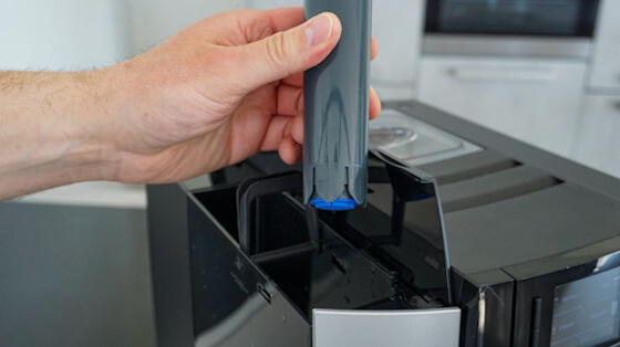 Heb je een waterfilter geïnstalleerd in je E8? Een filterpatroon verminderd kalkaanslag maar kan niet alle kalkaanslag voorkomen. Daarbij maakt het niet uit of je het Eccellente waterfilter of het Jura waterfilter gebruikt. Ontkalk je Jura E8 iedere zes maanden om achtergebleven kalkaanslag te verwijderen.