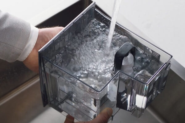 Stap 3: Leeg de melkkan, opvangbak en het waterreservoir. Spoel het reservoir goed om, vul het met schoon water en plaats het filter terug. Zet de melkkan weer onder de uitloop en laat de machine volledig doorspoelen. Na afloop is jouw Sage Oracle Jet weer kalkvrij en klaar voor gebruik.