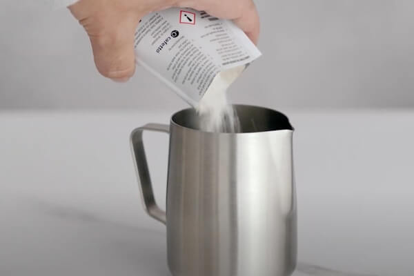 Stap 1: Doe de inhoud van een zakje steam wand cleaner in de melkkan (of gebruik 10 ml Eccellente stoompijpreiniger). Vul het kannetje daarna tot ongeveer de helft met heet water.